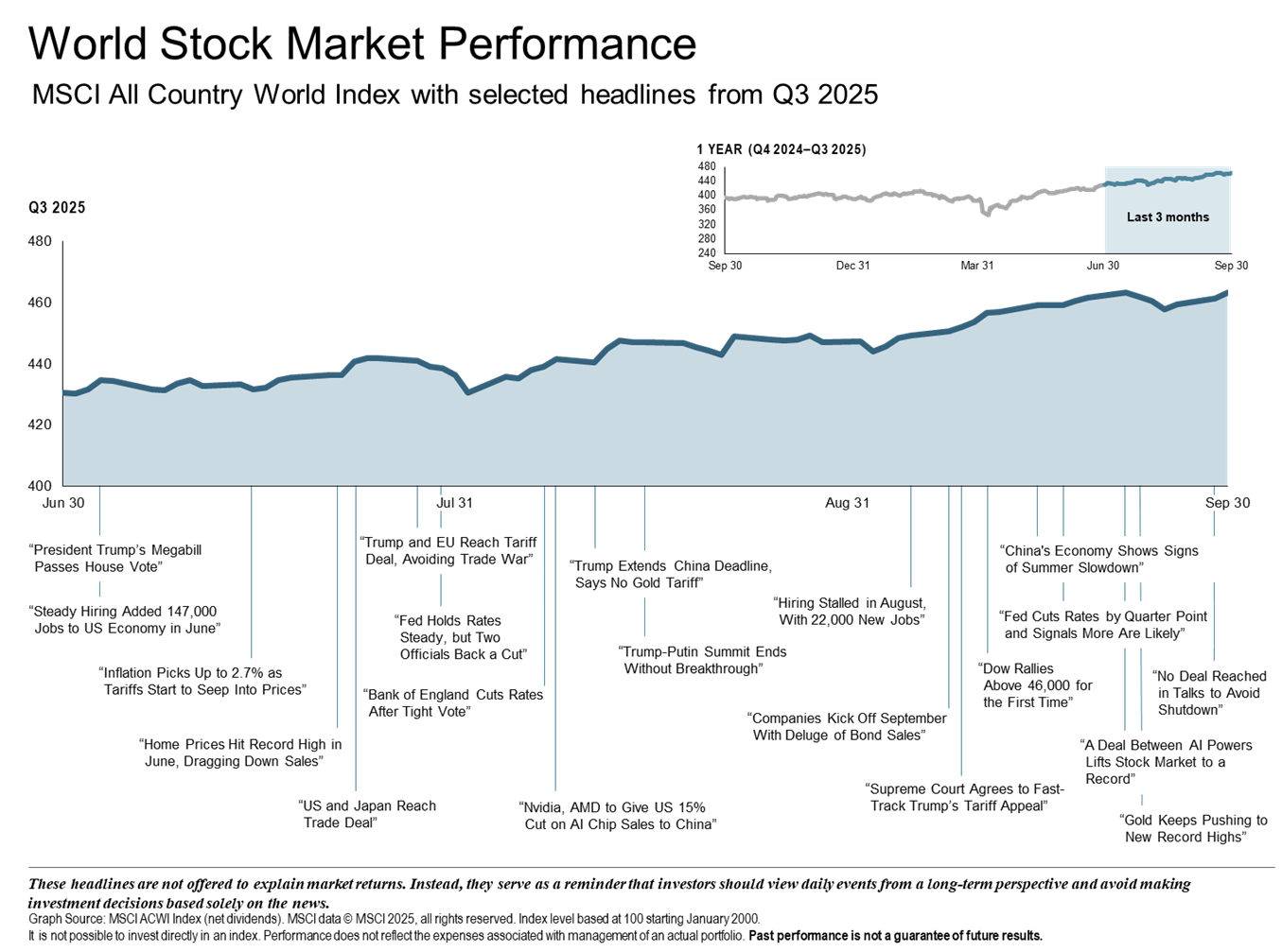 Many themes common for 2025 persisted in Q3. Global financial markets continued to perform strongly with equity markets avoiding the “September Effect” at the end of the quarter. Historically the worst month of the year for the stock market, from 1928 - 2023 the S&P 500 has averaged a decline during the month of September. Although it underperformed non-U.S. equities, the S&P 500 gained approximately 3.6% this September, its strongest September performance in 15 years.